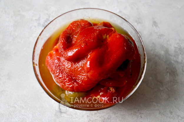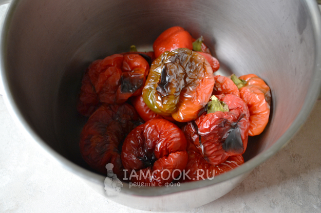 Запеченный перец переложите в кастрюлю или глубокую посуду, закройте крышкой и так оставьте на 10-15 минут.