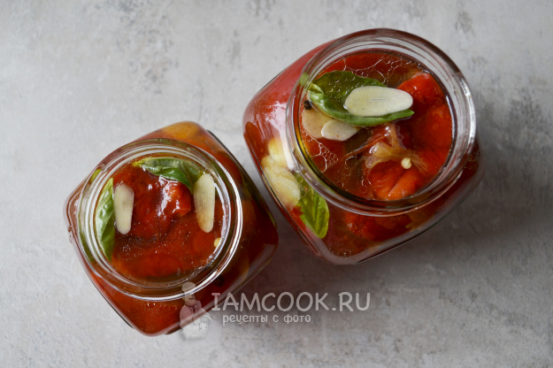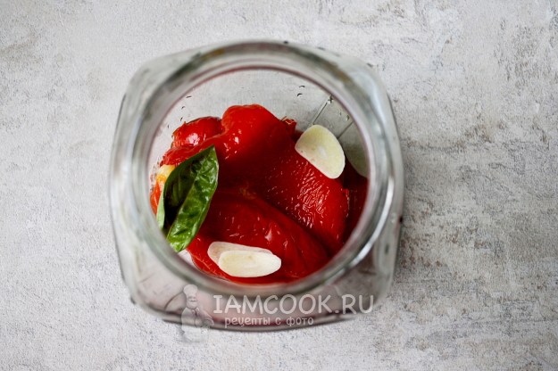 В тщательно промытую с содой банку положите слой очищенных перцев, листочек базилика и пластинку чеснока.