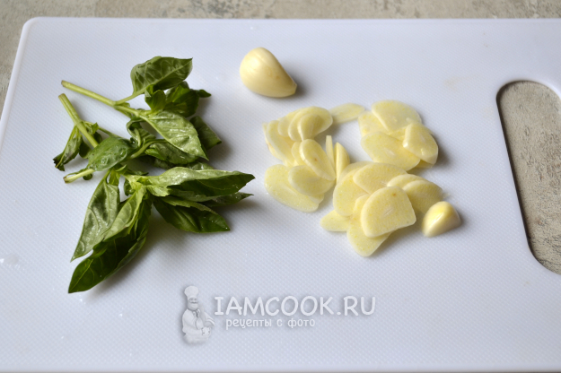 Очищенный чеснок нарежьте тонкими пластинками, базилик разберите на листочки.