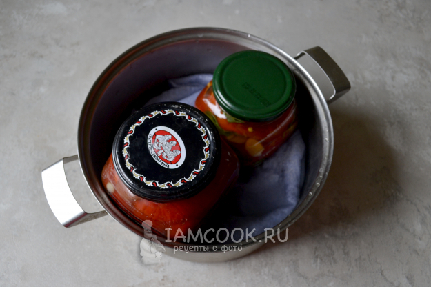 Прикройте банки крышками, поставьте их в кастрюлю с водой, на дно положите тканевую салфетку. Воды налейте по плечики банок. Стерилизуйте после закипания 25 минут. После стерилизации откройте банку, влейте уксусную эссенцию (пропорционально распределите 1 ч.л., если используете несколько банок) и герметично закрутите банку.