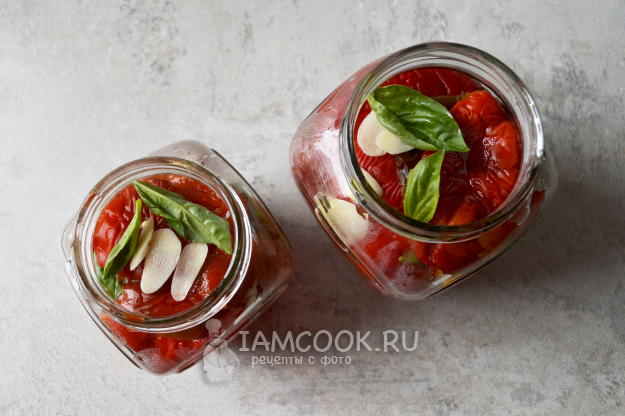 Заполните таким образом банку до верха, чередуя перец, чеснок и базилик.
