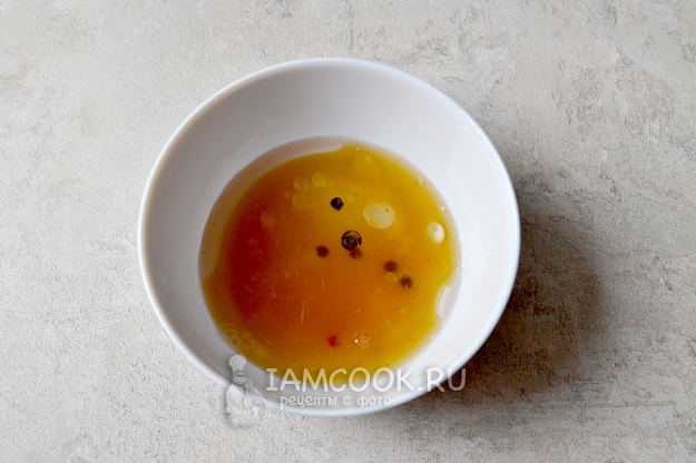 Приготовьте маринад. В миску влейте растительное масло, всыпьте сахар и соль, положите горошек черного перца.