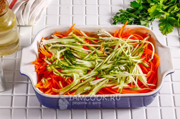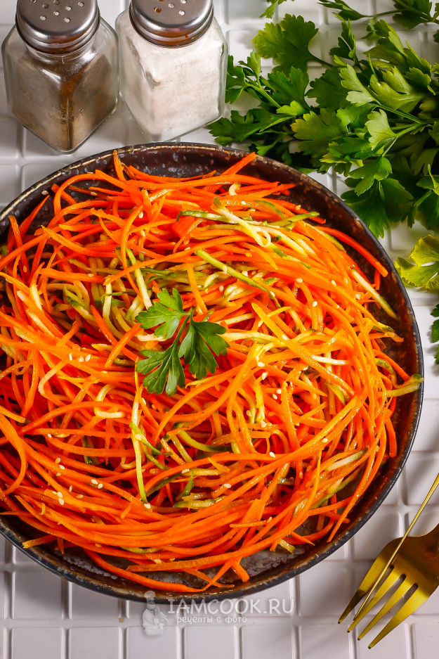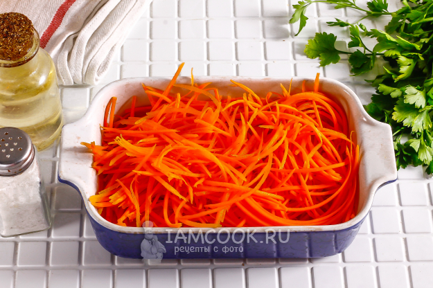 Очистите морковь от кожуры и промойте в воде. Можно использовать чуть меньше или чуть больше корнеплодов, если у вас большая семья. Натрите ее на терке для моркови по-корейски в глубокую емкость.