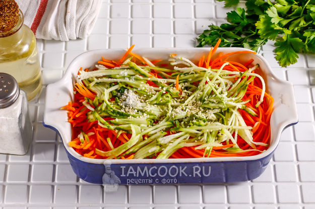 Всыпьте соль, кунжут и влейте растительное масло. Аккуратно все перемешайте. Можно это сделать с небольшим нажимом - блюдо станет еще сочнее. Ваш диетический салат из моркови полностью готов!