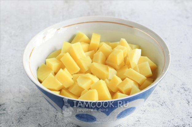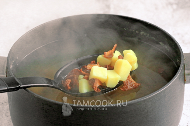 Картофель очистите и нарежьте кубиками, добавьте к размягченным грибам в кастрюлю. Посолите суп. Количество картофеля зависит от любимой вами густоты супа - больше или меньше. Варите до мягкости картофеля, минут 15.
