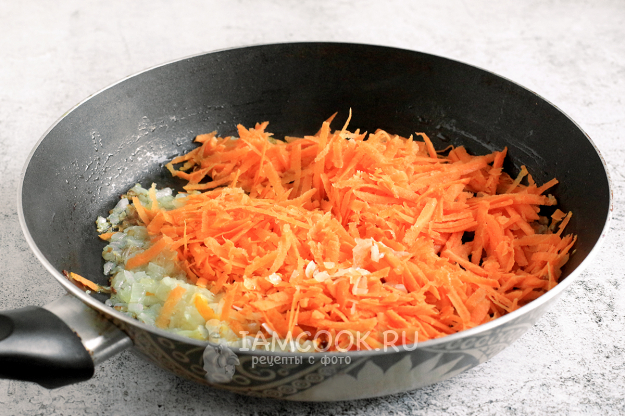 Обжарьте в растительном масле сначала лук, а затем добавьте морковь. Посыпьте овощи специями - кориандром, черным молотым перцем и слегка посолите.