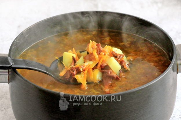 Затем жидкость отцедите через пару слоев марли и мелкое сито, чтобы избавиться от мелкого мусора, который может сохраняться на сухих грибах. Эту воду используйте для супа. Долейте ее в кастрюлю, где будет вариться суп, поместите туда же набухшие грибы. Варите их до приемлемой мягкости, это может быть и 15 минут, и 30 минут - у всех вкусы разные и грибы тоже разные.