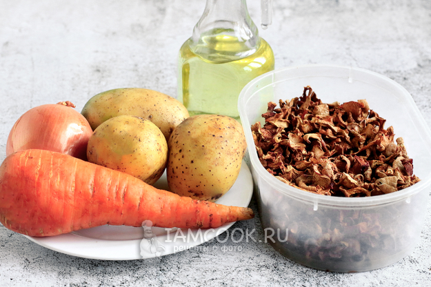 Итак, для приготовления диетического супа из сушеных лисичек подготовьте необходимые продукты по списку.