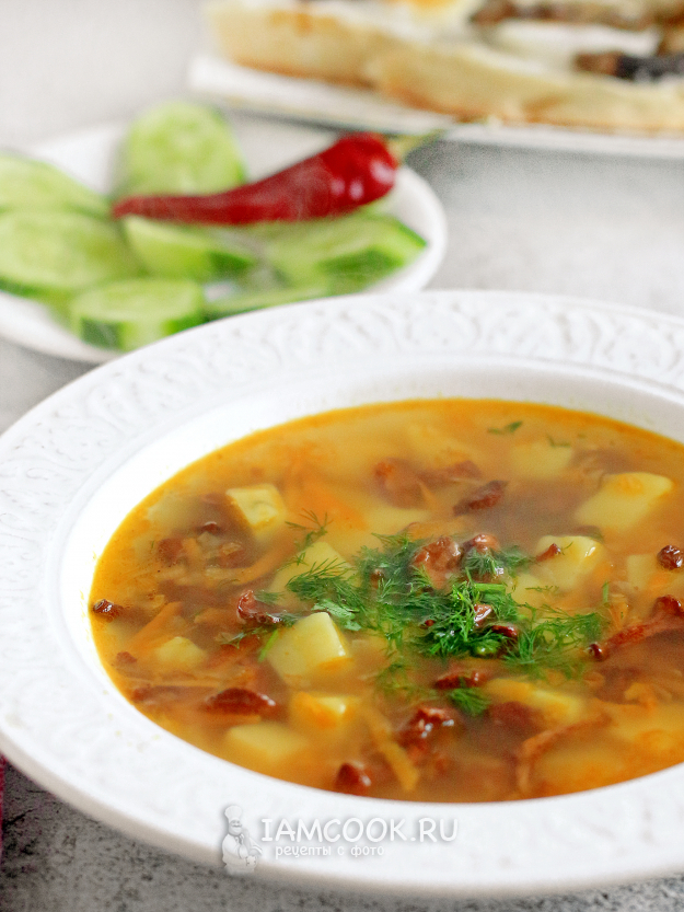 Грибной суп из сушеных лисичек готов. Подавайте его со свежей зеленью.
