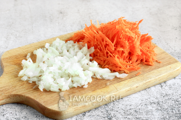 Лук и морковь очистите. Морковь натрите на крупной терке, а лук нарежьте помельче.