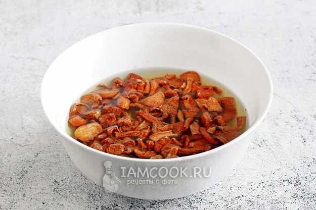 Лисички залейте горячей водой, накройте тарелкой и оставьте на 20 минут для набухания.