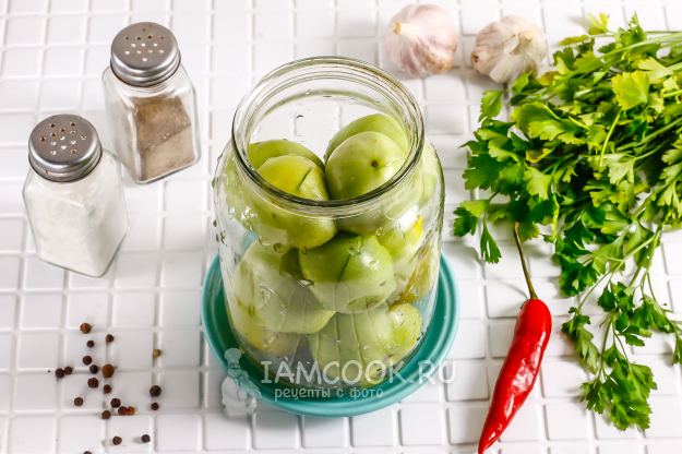 Подготовьте необходимые ингредиенты для приготовления зеленых помидоров по-армянски на зиму (с чесноком и зеленью).