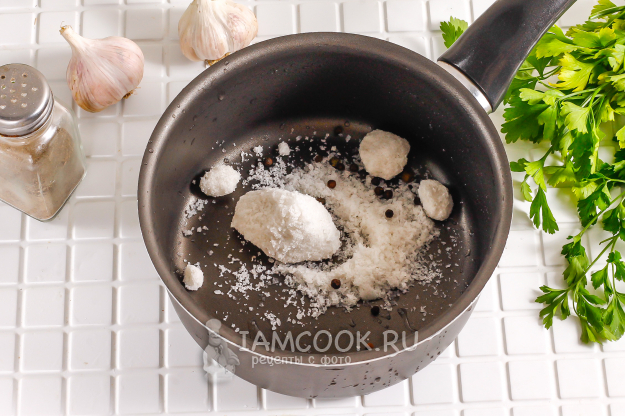 Всыпьте в ковш или кастрюлю соль, горошины черного перца. Можно добавить и другие приправы, пряности.