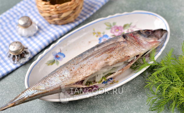 Вложите рыбе в брюшко несколько веточек укропа и пару-тройку слайсов репчатого лука.