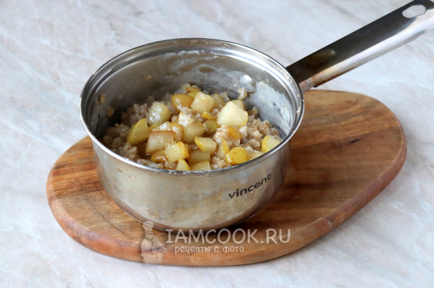 Карамелизированные груши переложите в сотейник с готовой овсяной кашей и перемешайте. Часть груш можно оставить для подачи.