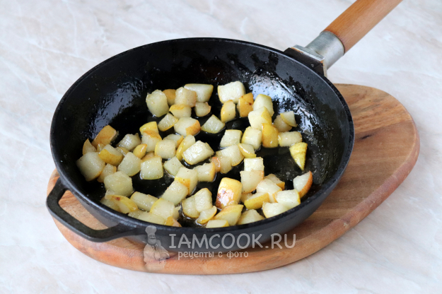 Карамелизируйте груши на небольшом огне, периодически помешивая, в течение 5-7 минут. За это время они должны пропитаться специями и маслом, стать более мягкими, но при этом сохранить свою целостность.