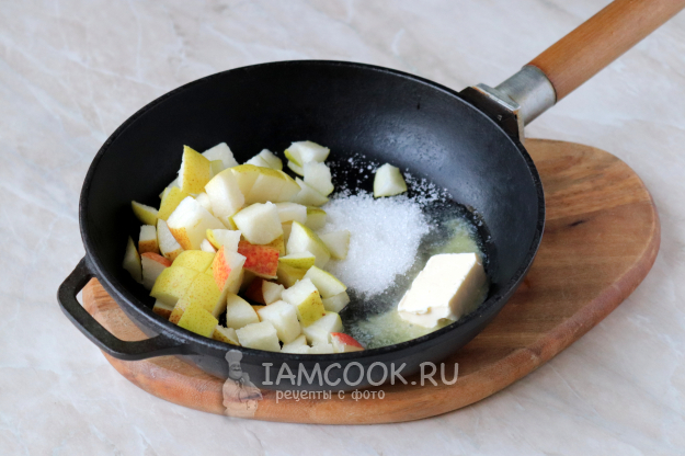 Груши помойте под холодной проточной водой, удалите семенную коробочку, а мякоть нарежьте средними кубиками. Выложите их в сковороду. К грушам добавьте кусочек сливочного масла, сахар и молотую корицу. Отправьте сковороду на огонь.