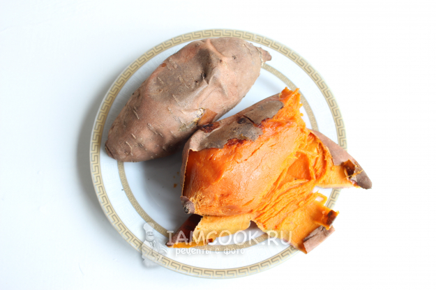 Разогреем духовку до 200 градусов и запечем батат в мундире, 35 минут. Во время запекания батат можно перевернуть несколько раз. Батат остудить и очистить от кожуры.