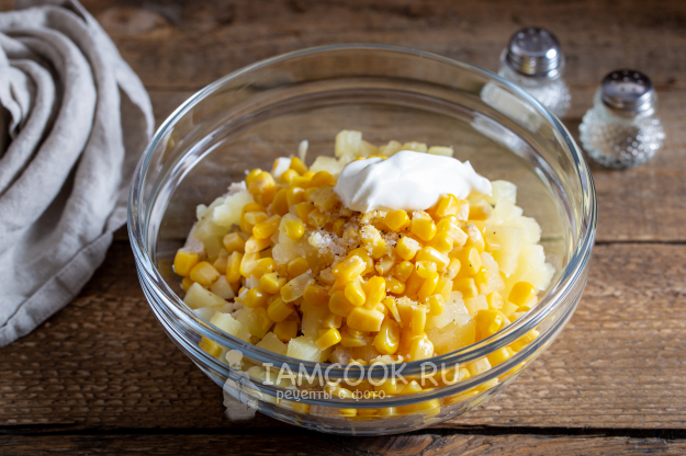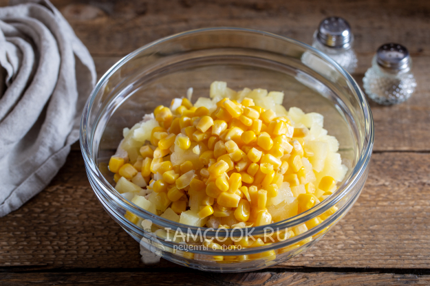 Добавьте в салат к ранее подготовленным ингредиентам нужное количество консервированной кукурузы.