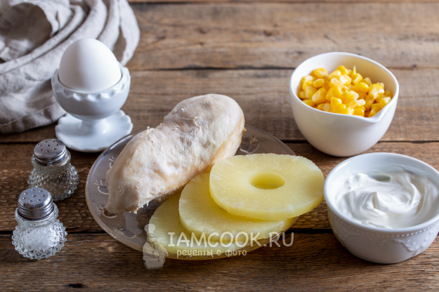 Подготовьте указанные ингредиенты для диетического салата с ананасом и курицей (ПП). Куриную грудку и яйцо предварительно отварите и остудите. Готового салата получается на 1-2 порции.