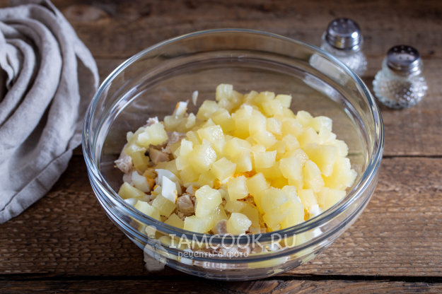 Консервированный ананас извлеките из банки и порежьте кубиком, добавьте в салатник.