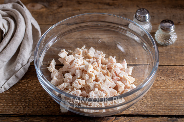 Предварительно отваренное и охлаждённое куриное филе нарежьте кубиком и выложите в подготовленную посуду для салата.