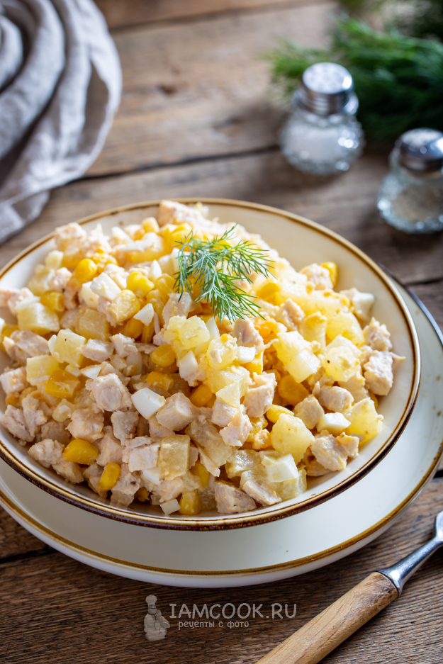 На стол диетический салат с ананасом и курицей подавайте сразу по его приготовлению или слегка охлаждённым. Приятного аппетита!