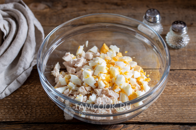 Варёное яйцо очистите от скорлупы и порежьте кубиком. Добавьте в посуду к курице.