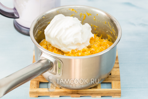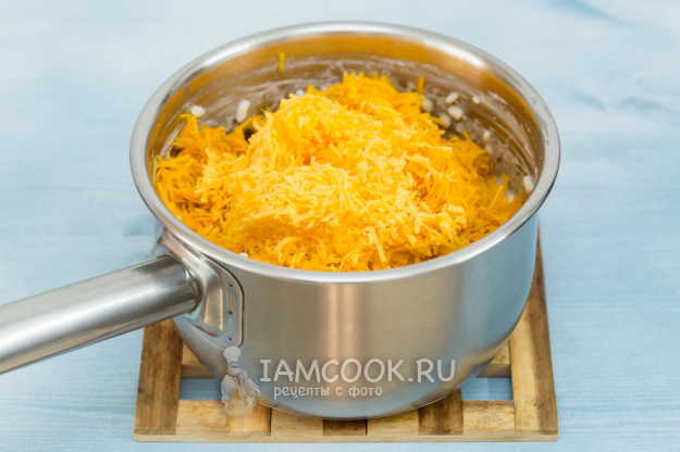 Добавьте натертые на мелкой терке тыкву и сыр.