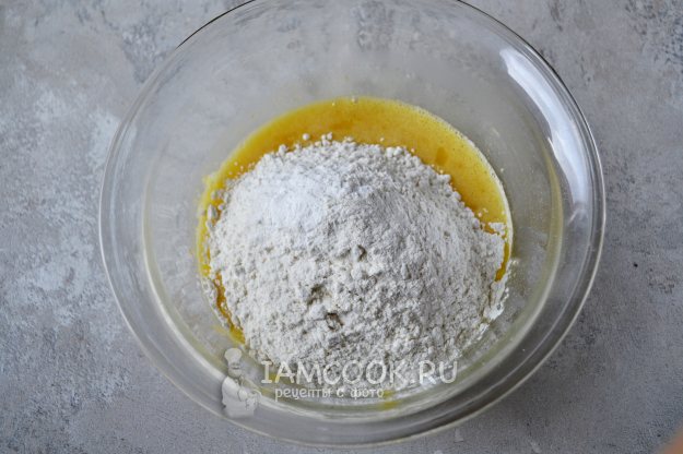 Перемешайте муку с жидкой основой, чтобы получилось тесто без комочков. Влейте растительное масло и еще раз тщательно перемешайте тесто.