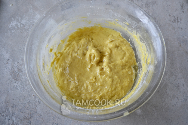 Перемешайте пюре и яйца и всыпьте просеянную муку и разрыхлитель.