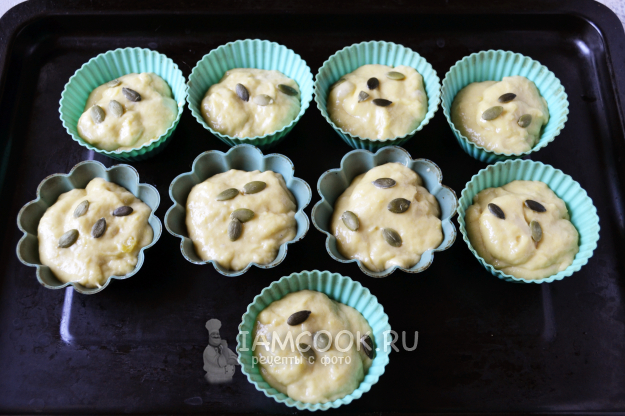 Силиконовые формочки заполните тестом примерно наполовину. По желанию можете присыпать будущие кексы тыквенными семечками. Поставьте противень в заранее разогретую до 180°С духовку на средний уровень. Нагрев духовки - верх-низ.
