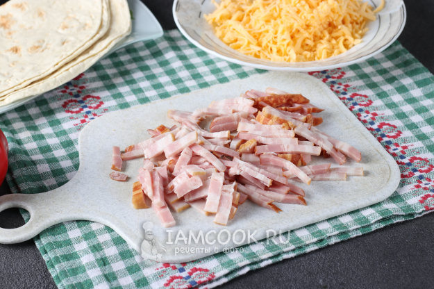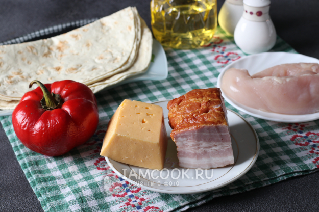 Для приготовления кесадильи с беконом, курицей и сыром подготовить из списка необходимые ингредиенты.