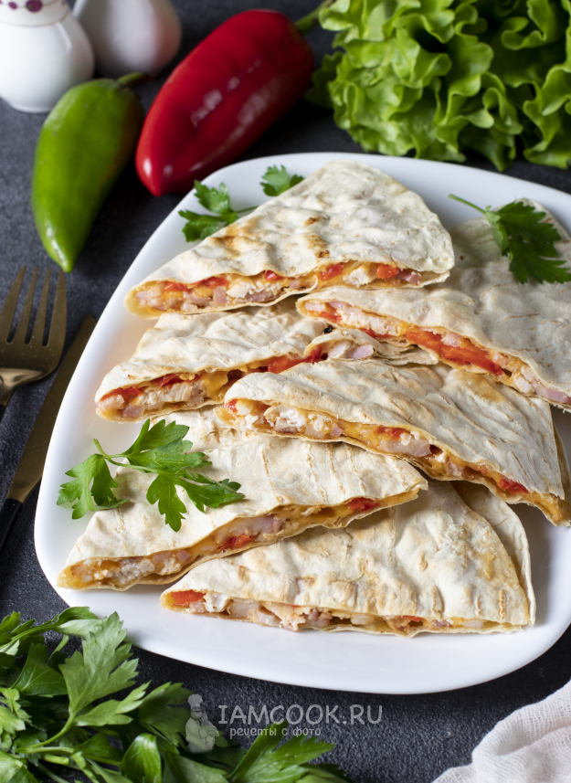 Кесадильи с беконом, курицей и сыром готовы. Разрезать каждую на 3 части и подать к столу.