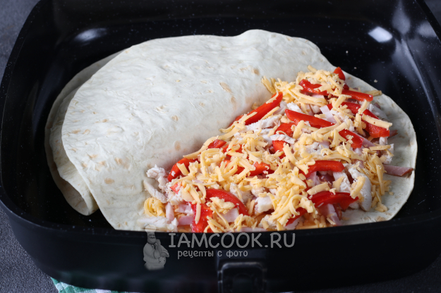 Все ингредиенты разделить на 2 части. Лепёшку выложить в сковороду-гриль, половину лепёшки посыпать частью сыра, затем выложить филе курицы, бекон и сладкий перец, посыпать оставшимся сыром. Так же сформировать и вторую лепёшку.