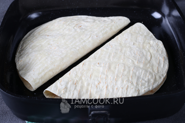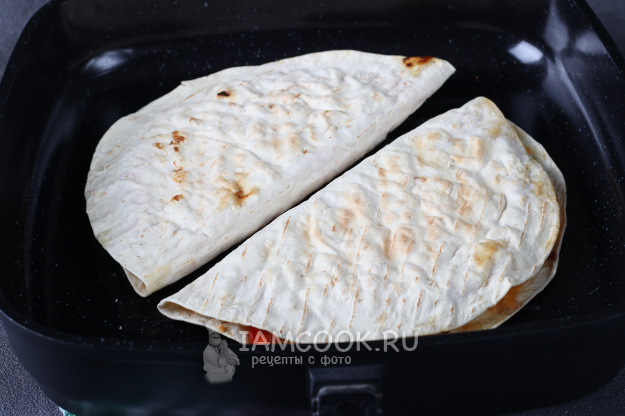 Готовить, пока лепёшки немного не подрумянятся и не расплавится сыр внутри. Перевернуть лепёшки на другую сторону и также немного подрумянить.