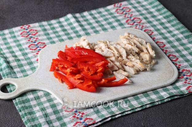 Остывшее филе нарезать соломкой. Перец очистить от семян и также нарезать крупной соломкой.