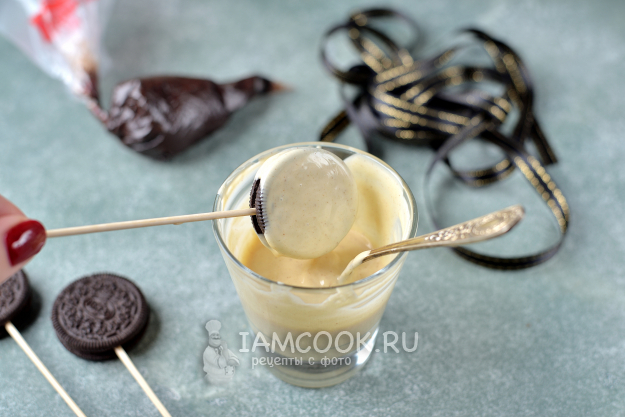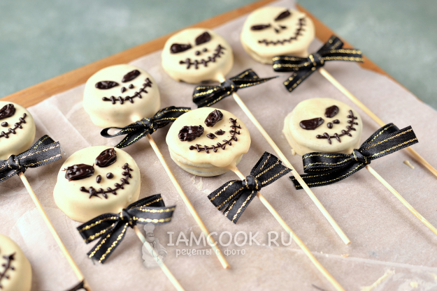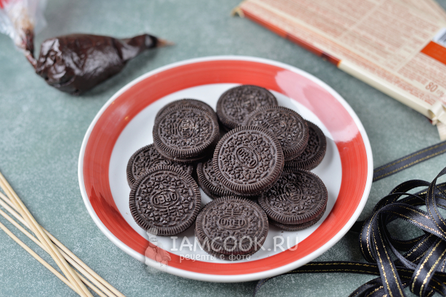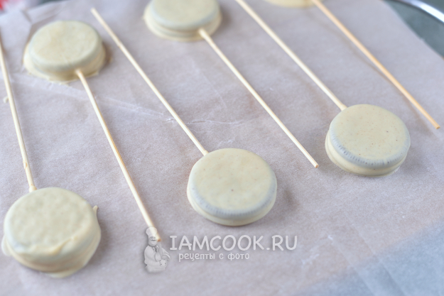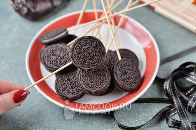 Каждое печенье нужно нанизать на тонкую бамбуковую шпажку, лишнюю ее длину всегда потом сможете отрезать кухонными ножницами.