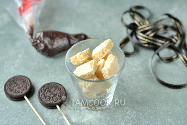 Подготовьте все необходимое для приготовления кейкпопсов Скелетоны на Хэллоуин.