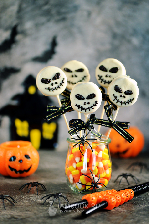 Кейкпопсы Скелетоны на Хэллоуин готовы. Нарежьте черную ленточку, завяжите ее вокруг шпажки бантиком и можно подавать сладости к столу.