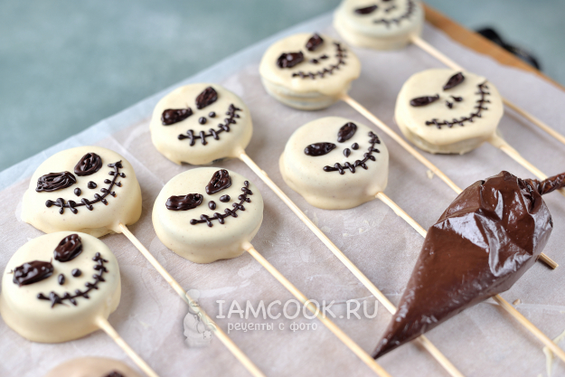 Растопите черный шоколад в кондитерском мешке, нарисуйте им глаза, нос и рот с зубами, отправьте в холодильник еще раз, чтобы черный шоколад также хорошенько застыл.