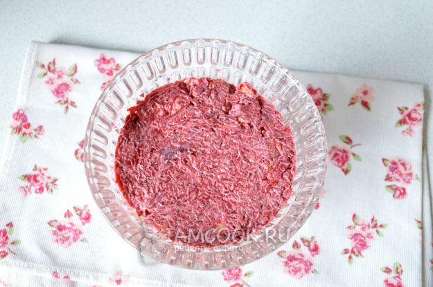 К натертой свекле добавить крупно нарубленные грецкие орехи и 1/3 часть майонеза, посолить, поперчить и перемешать. Выложить вторым слоем в салатник.
