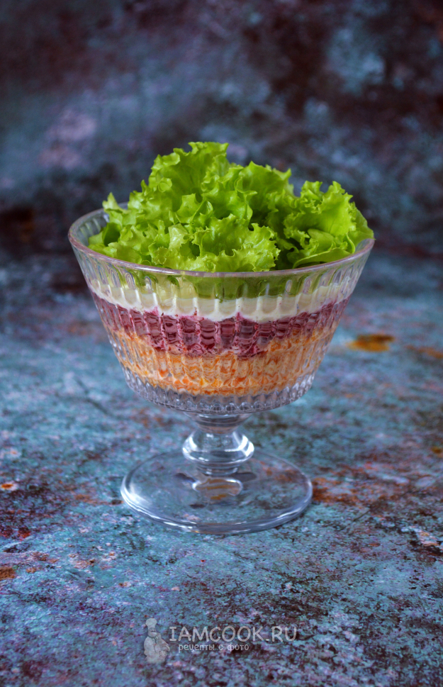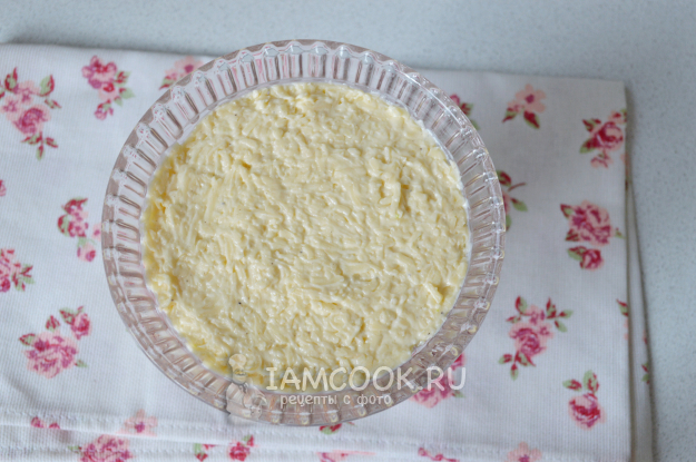 К натертому сыру добавить измельченный чеснок и оставшийся майонез, посолить и поперчить. Перемешать и выложить третьим слоем в салатник.