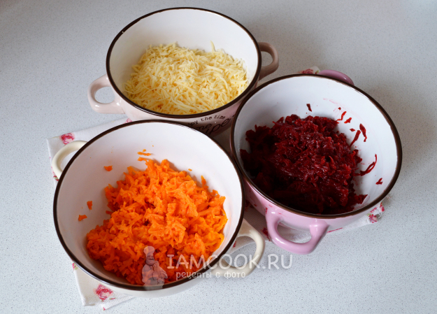 Морковь, свеклу и сыр по отдельности натереть на мелкой терке. Из свеклы отжать лишний сок.