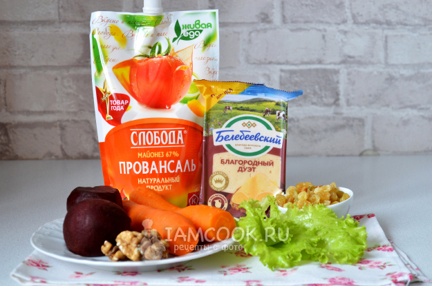 Подготовить продукты для салата «Дюймовочка». Свеклу и морковь заранее отварить, остудить и очистить. Изюм запарить.