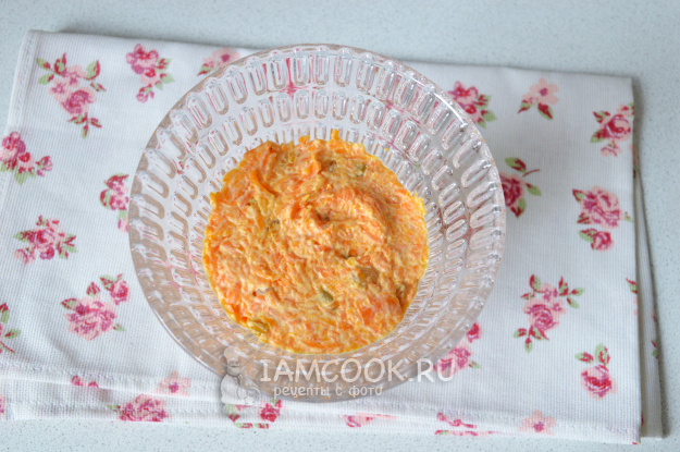 К натертой моркови добавить распаренный изюм и 1/3 часть майонеза, посолить, поперчить и перемешать. Выложить первым слоем в салатник.