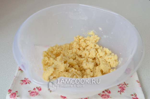Смешать в миске муку, сахар, ванильный сахар, разрыхлитель и соль. Добавить кусочки размягченного сливочного масла и яйцо.