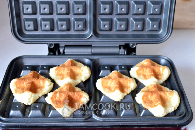Вафельницу разогреть и смазать маслом. Выложить шарики теста на расстоянии друг от друга. Испечь хрустящее печенье в вафельнице до золотистого цвета. Готовое печенье остудить.