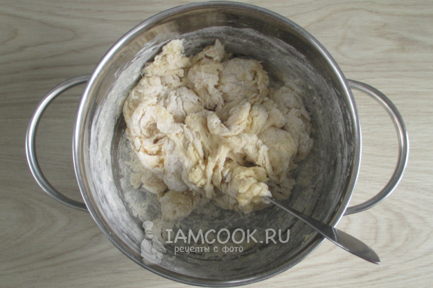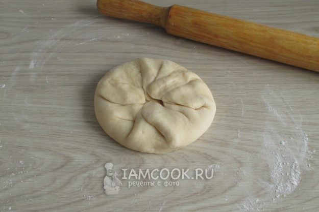 Стяните края теста к центру, защипните их и затем снова раскатайте лепешку толщиной около 2-х см и диаметром 15-16 см.