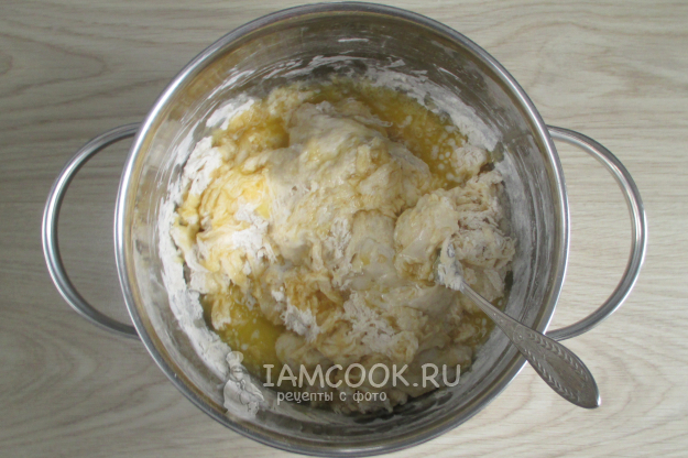 В опару добавьте все остальные ингредиенты для теста, влейте размешанные целое яйцо и белок яйца.